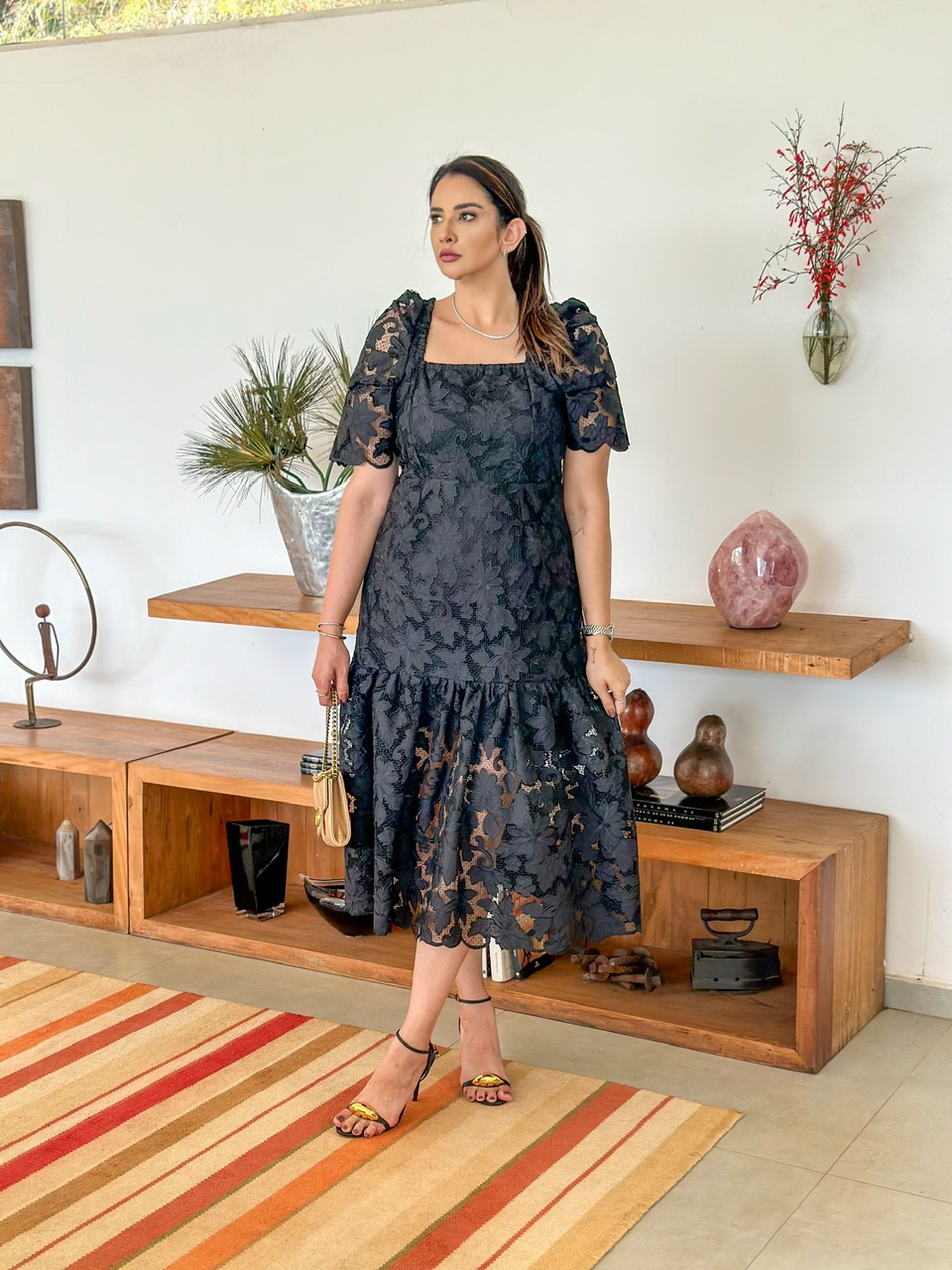 Com sua modelagem única e delicada, este vestido oferece um visual sofisticado sem perder o toque casual.  Além disso, ele combina perfeitamente com diversas ocasiões.