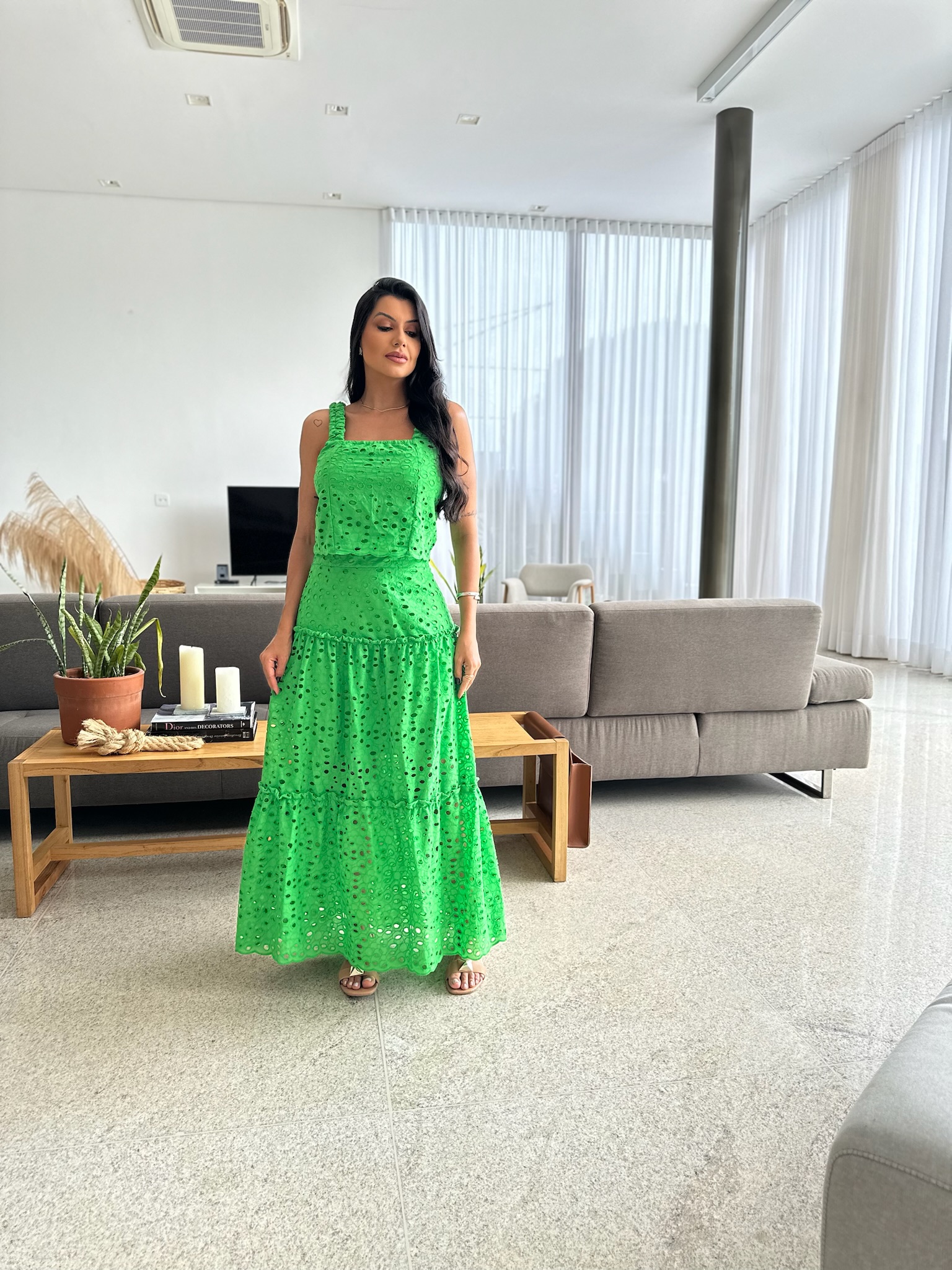 Com sua modelagem única e delicada, este vestido oferece um visual sofisticado sem perder o toque casual. Além disso, ele combina perfeitamente com diversas ocasiões.