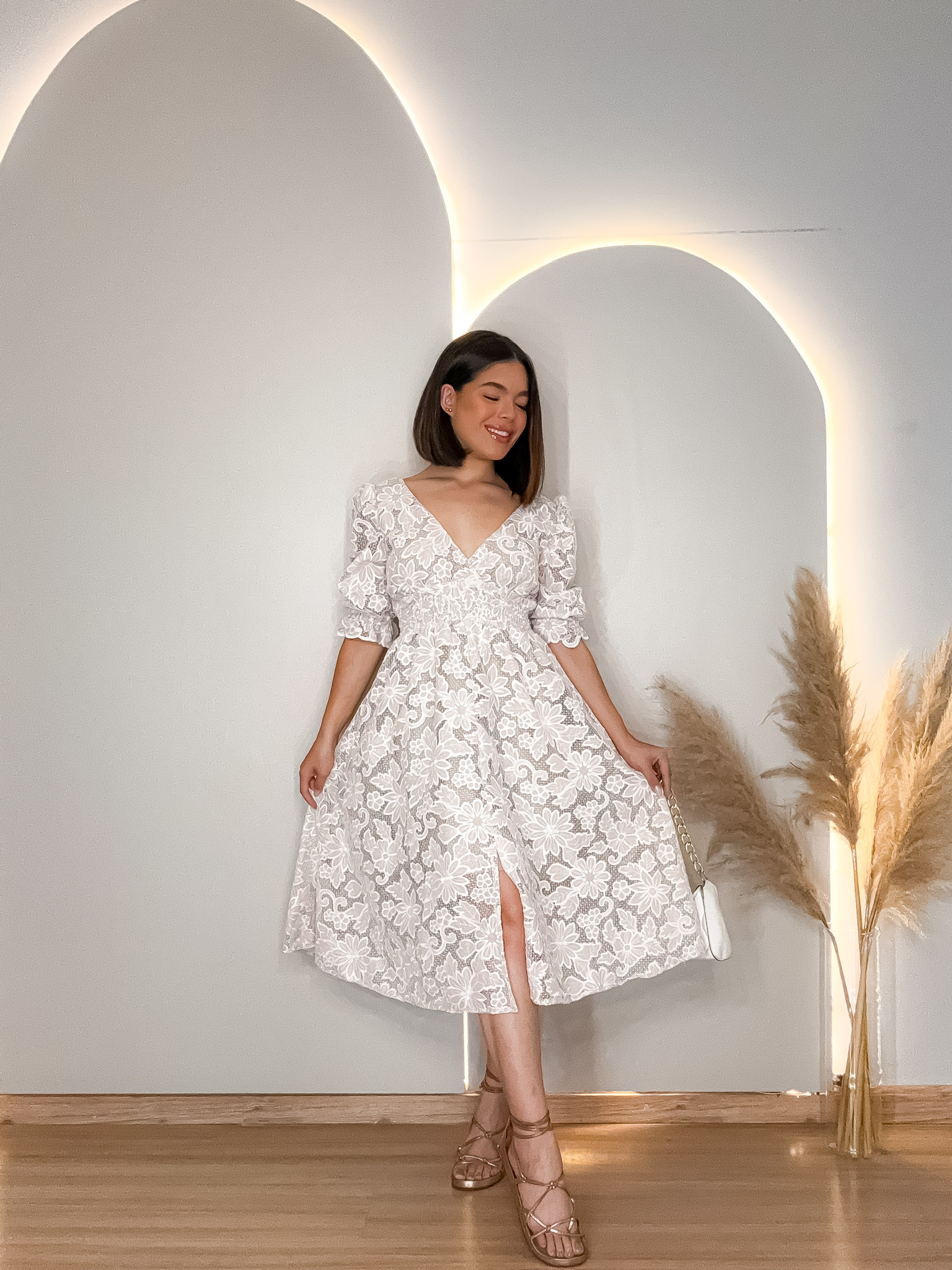 O Vestido Vitória é todo na renda guipir, uma renda francesa super nobre e elegante. Vestidos na renda guipir é a escolha perfeita para quem busca unir tendência e elegancia em uma única peça. Com sua textura macia e elegante, o vestido de guipir é ideal para que ama unir a sofisticação com o conforto, enquanto o corte elegante e chique do vestido confere um toque refinado ao visual.