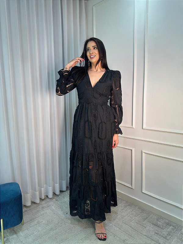 OPORTUNIDADE - Vestido Glória Longo Cordonê Manga bufante Bicolor Preto