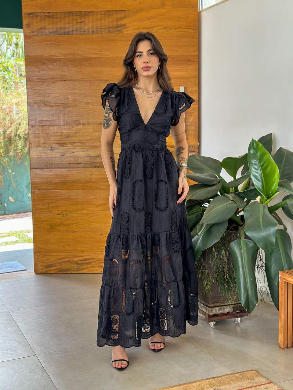 Com sua modelagem única e delicada, este vestido oferece um visual sofisticado sem perder o toque casual. Além disso, ele combina perfeitamente com diversas ocasiões.