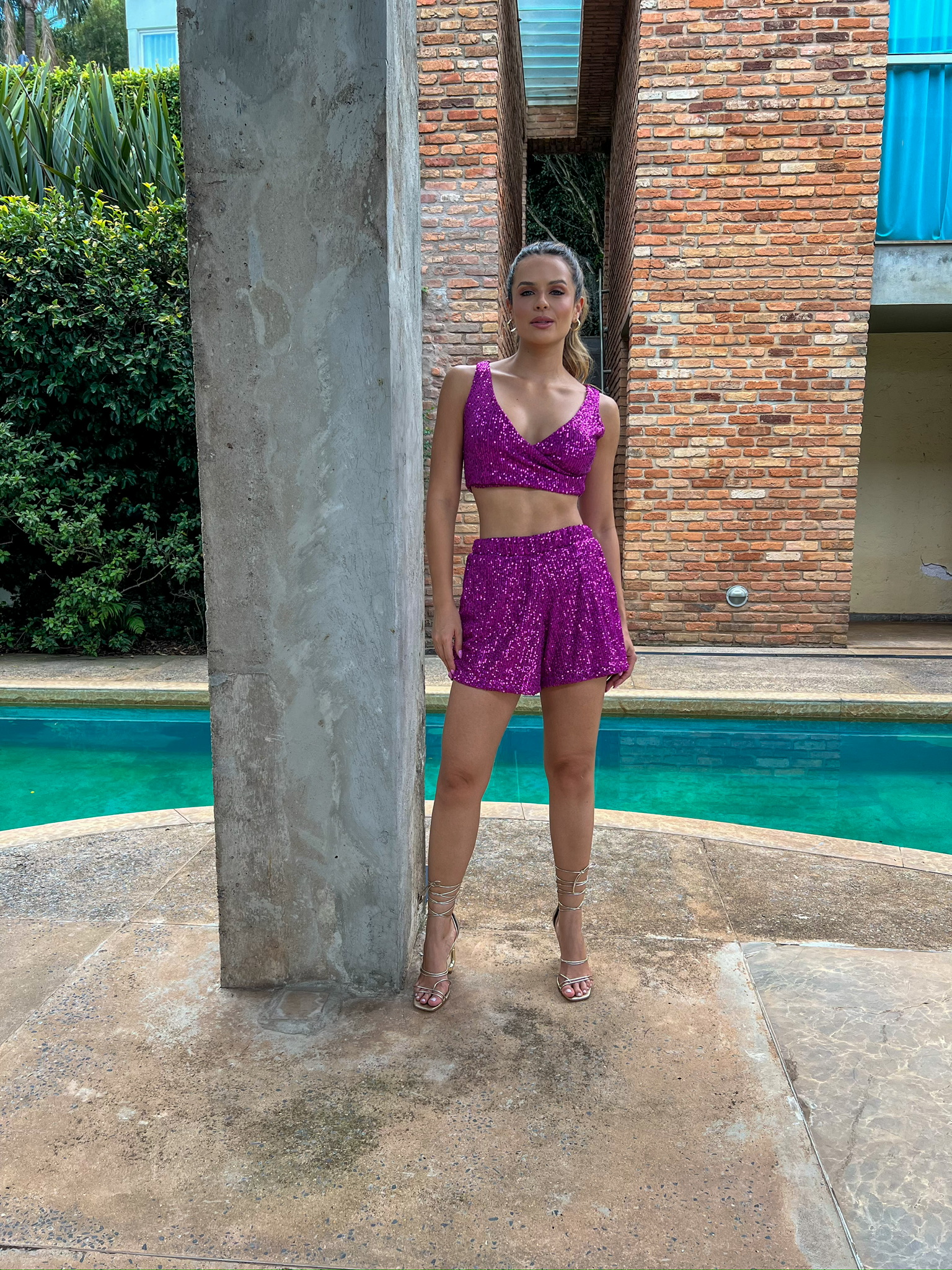 - Top de paetê com um decote elegante e recortes que valorizam.